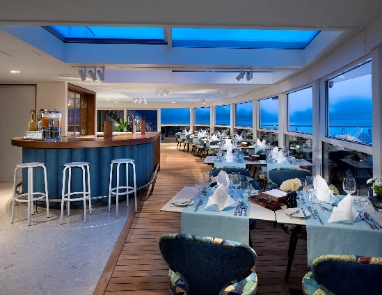Outdoors, the double width of space on the top deck seems extravagant! The sundeck has a large heated pool, a whirlpool and a sky bar. And another innovation: a pop-up elevator that serves all four public decks of the ship.